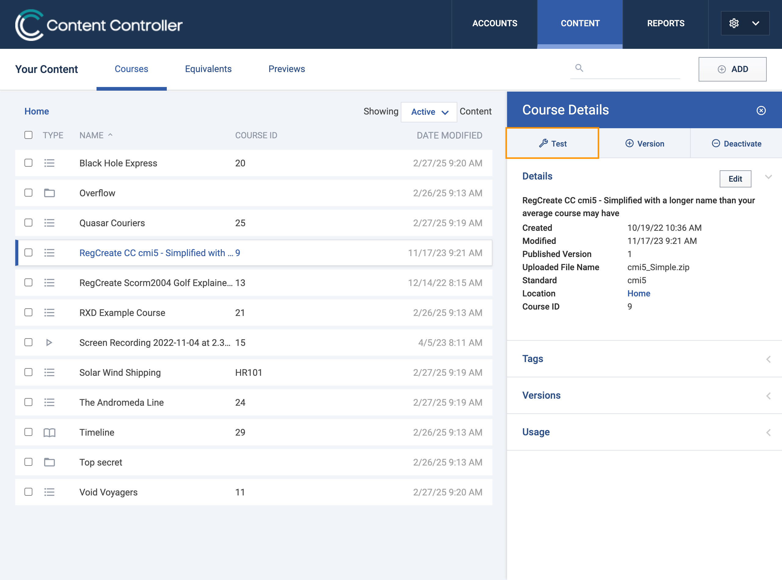 Built into Content Controller is a testing sandbox environment that lets you test, troubleshoot, and configure your content before sharing it with your accounts and learners.&#x20;