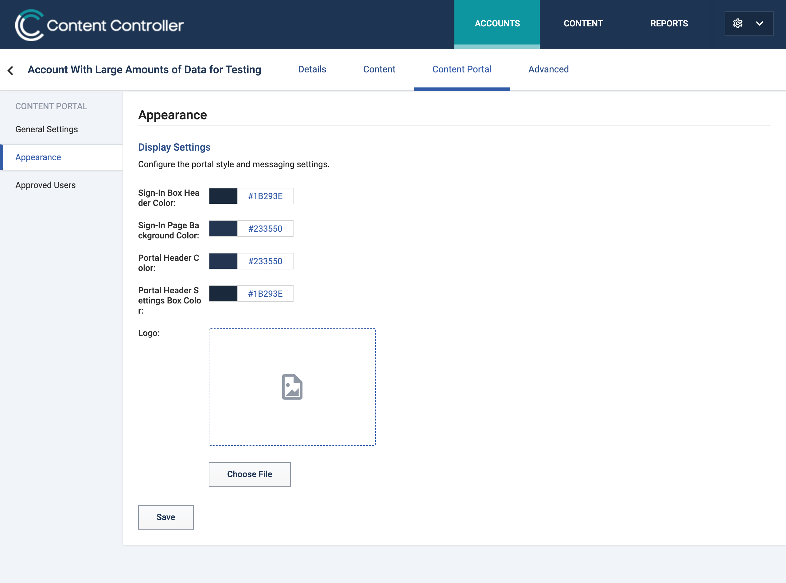 Here are all the current options available for an Account's Content Portal. After making any changes you must hit **Save** for them to update.