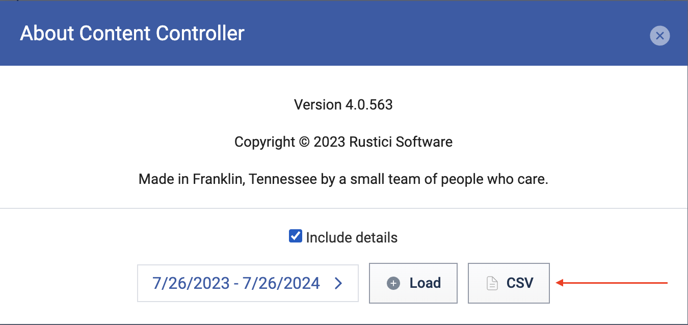 You can also export your learner counts. After checking the "**Include** **details**" checkbox, a new button labeled "**CSV**" will appear. Clicking this button will download an export for the selected date range.